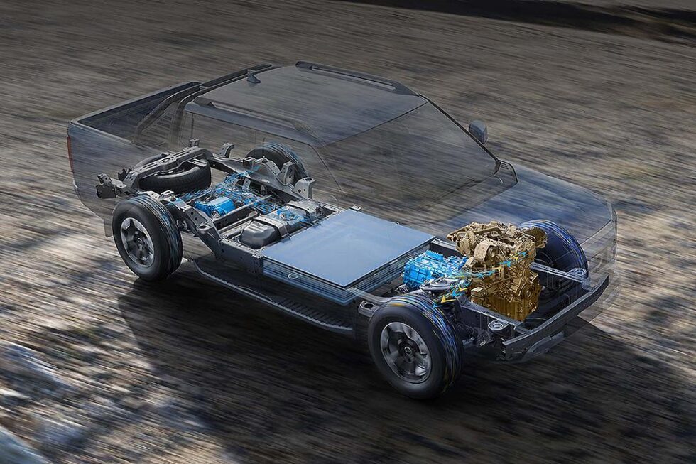 The battery is part of a revolutionary powertrain for the ute category that includes a permanent magnet synchronous electric motor at each axle and a turbo-petrol motor up-front.